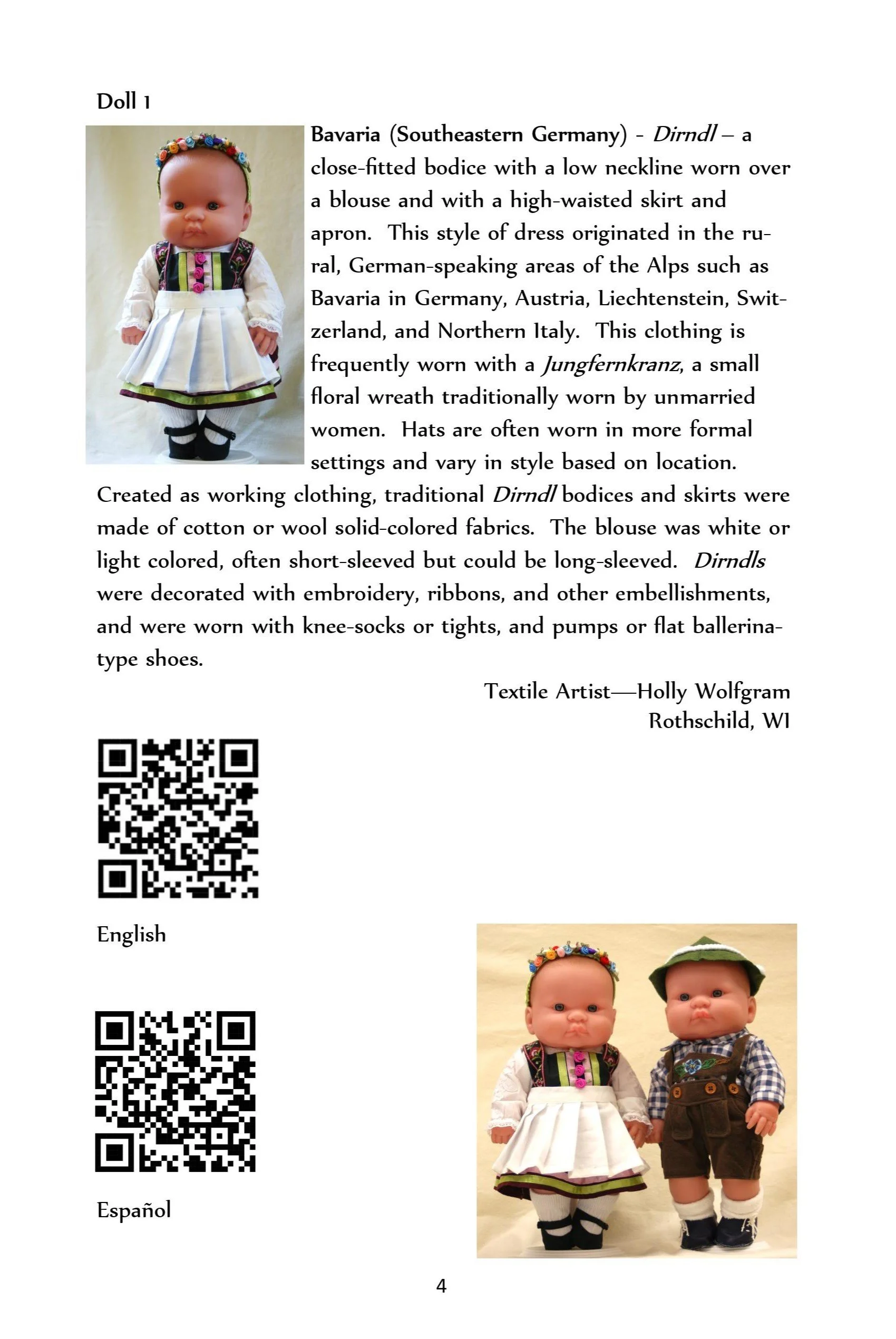 Cultural Threads is a collection of baby dolls wearing handmade, authentic, traditional, cultural clothing. All cultures represented can be found in North Central Wisconsin. This collection of dolls is a traveling exhibit throughout North Central Wisconsin, beginning in November 2023.
