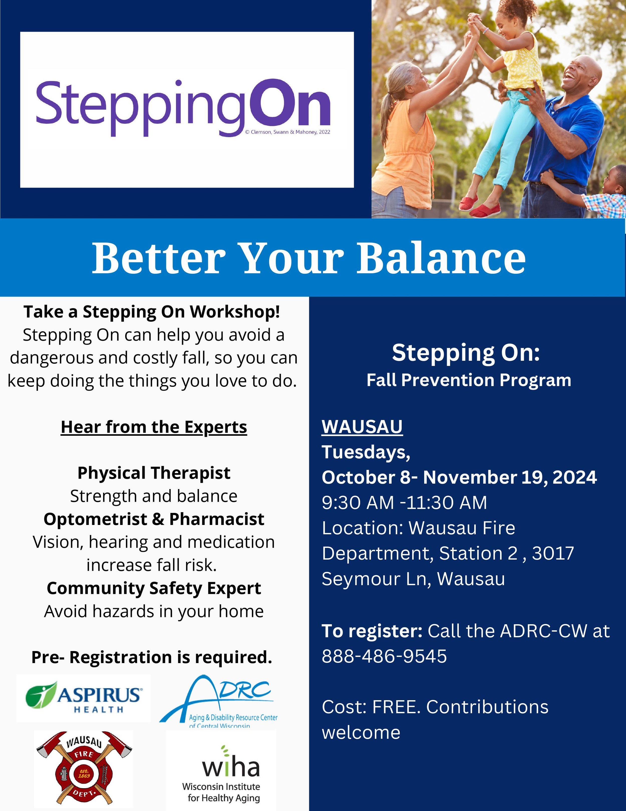 The ADRC, Aspirus and Wausau Fire Department are collaborating to offer a Stepping On (Fall Prevention) program this fall in Wausau and we were hoping you would be willing to help us spread the word!