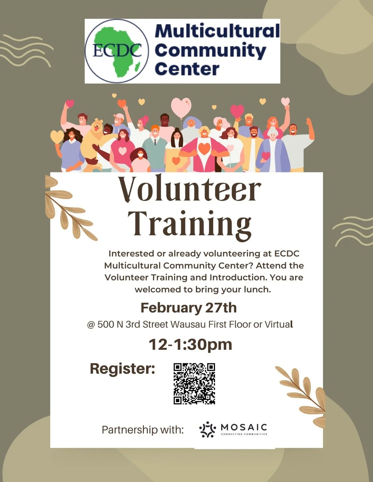 Become a volunteer for ECDC Wausau! On Thursday, February 27th Mosaic will be partnering with ECDC Wausau and co-hosting a volunteer training for those who are interested in or who are already volunteering for the ECDC Multicultural Community Center from 12:00pm-1:30pm. The event will be held at 500 N. 3rd St. on the First Floor.